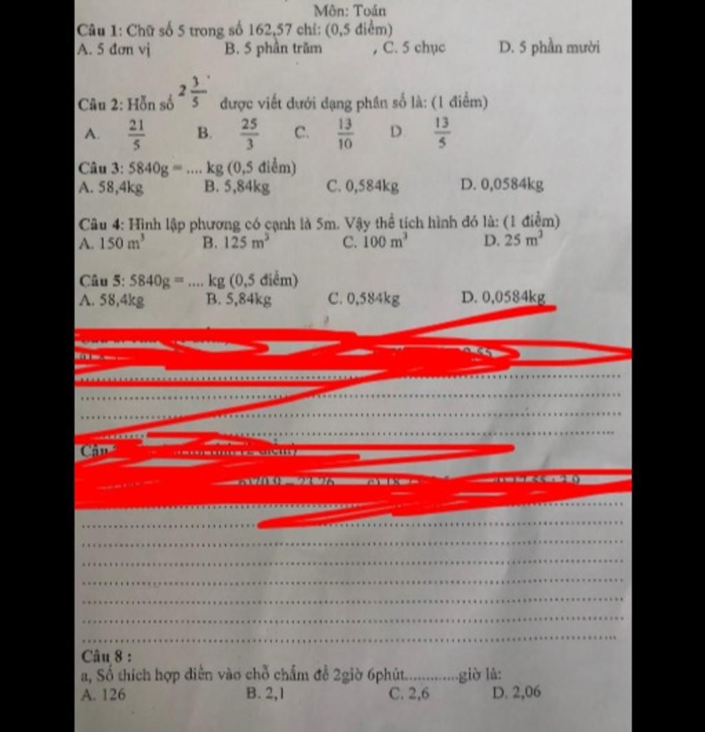 Câu 5. `B` `_` `1000` g `=` `1 kg` nên `5840 g = 5840 : 1000 = 5,84 ( kg )`