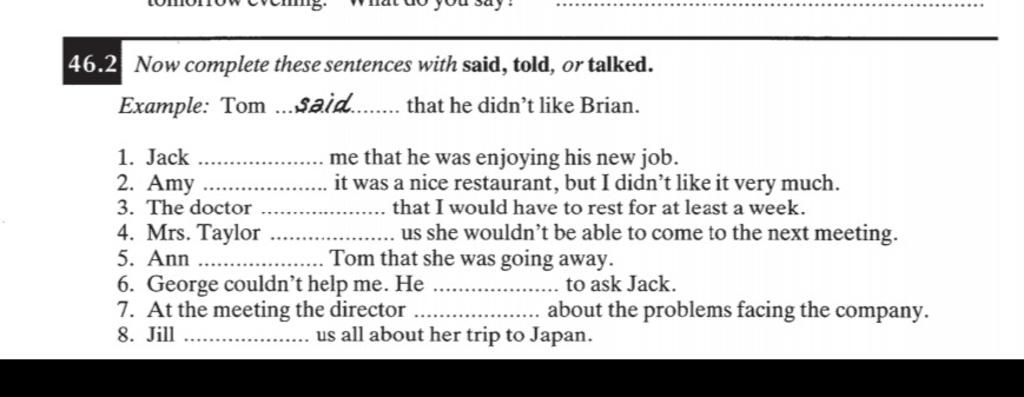 $-^{}$ S + talked + to O + that + S + V(lùi thì)