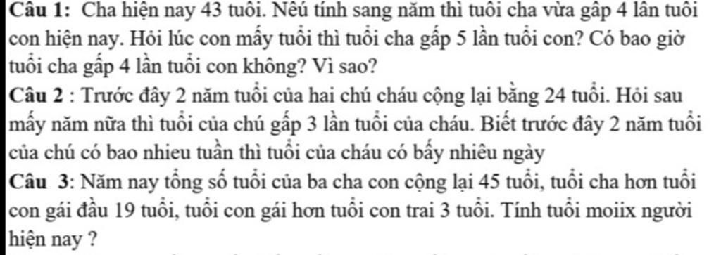 $\text{24 : ( 7 + 1) = 3 ( tuổi)}$
