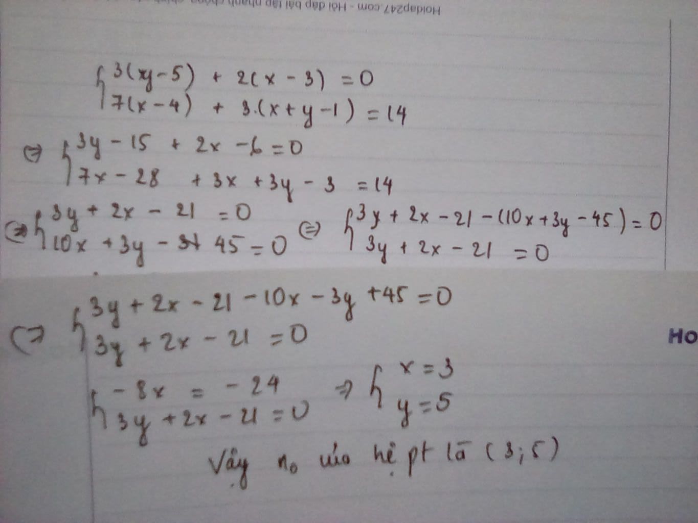 3(y-5)+2(x-3)=0 và 7(x-4)+3(x+y-1)=14