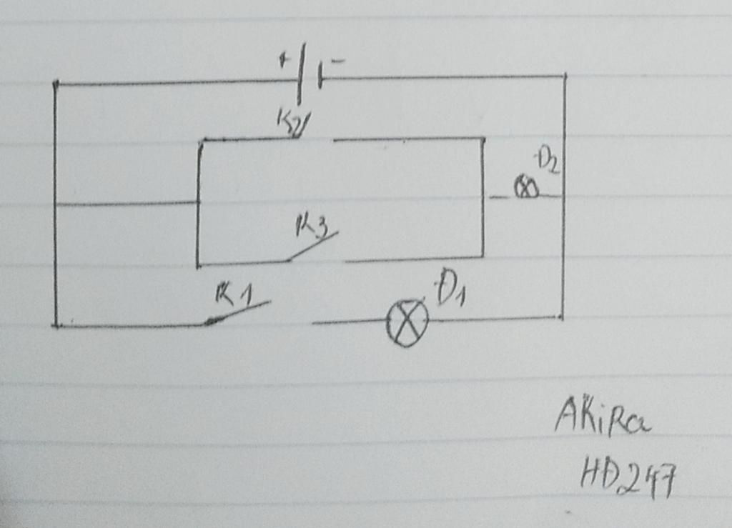 Hãy vẽ sơ đồ mạch điện gồm: 1 nguồn điện, 2 đèn Đ1 và Đ2; 3 khóa K1; K2; K3 thỏa mãn đồng thời điều kiện sau: K1 đóng, K2; K3 mở chỉ có 1 đèn sáng.