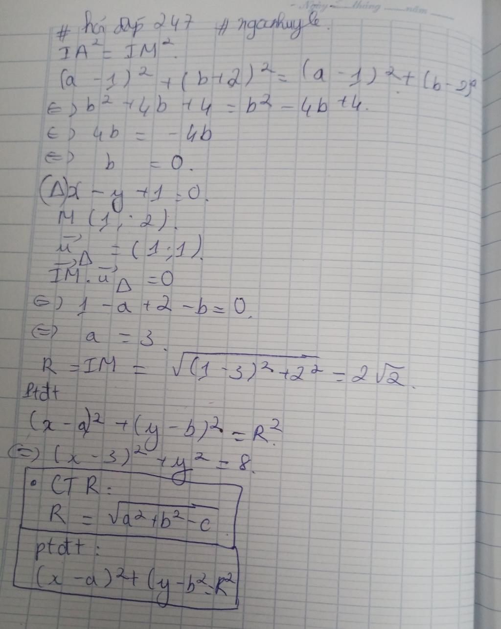 Bán kính $R=IM=\sqrt{(1-3)^2+2^2}=2\sqrt{2}$