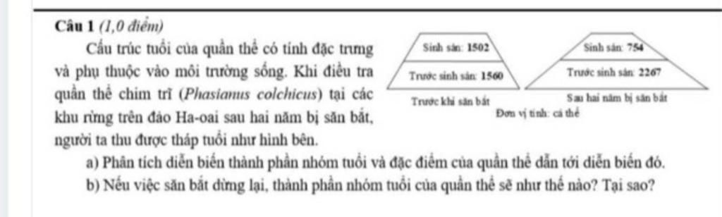 a. Cả 2 biểu đồ trước săn bắn và sau săn bắn đều là dạng tháp tuổi phát triển, tuy nhiên nếu việc săn bắn vẫn tiếp tục diễn ra số lượng cá thể trong độ tuổi sinh sản giảm xuống, số lượng độ tuổi trước sinh sản cũng giảm đi-> quần thể suy vong