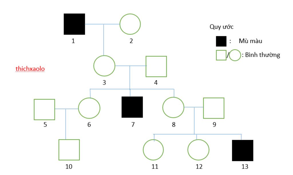 `(1), (7), (13)` là nam bị bệnh `→` Có kiểu gen `X^aY`