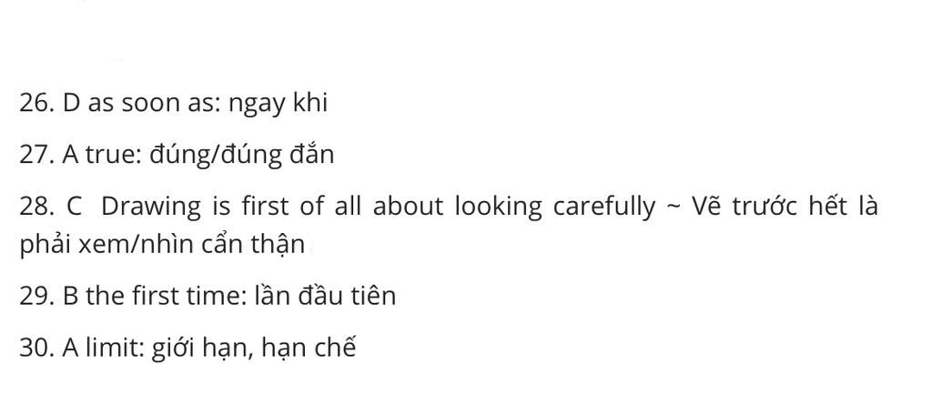 28. C (Drawing is first of all about looking carefully ~ Vẽ trước hết là phải xem/nhìn cẩn thận)
