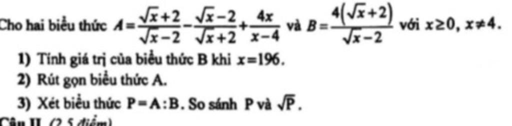 $P=\dfrac{4\sqrt{x}}{\sqrt{x}-2}:\dfrac{4\left( \sqrt{x}+2 \right)}{\sqrt{x}-2}$