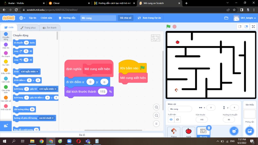 Bước 5: Lập trình đoạn kết. Bạn vẽ một ô chữ nhật có chữ kết thúc rồi lập trình nếu chạm nó thì xuất hiện you win. Mình k bt chỗ kết thúc của bạn ở đâu nên bạn tự làm nhé