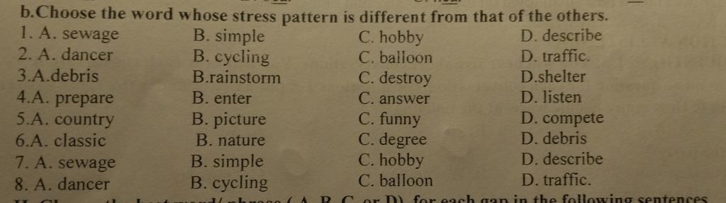 1.A. 'sewage B. 'simple C.'hobby D. de'scribe