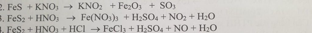 2FeS + 9KN{O_3} \to 9KN{O_2} + F{e_2}{O_3} + 2S{O_3}\\