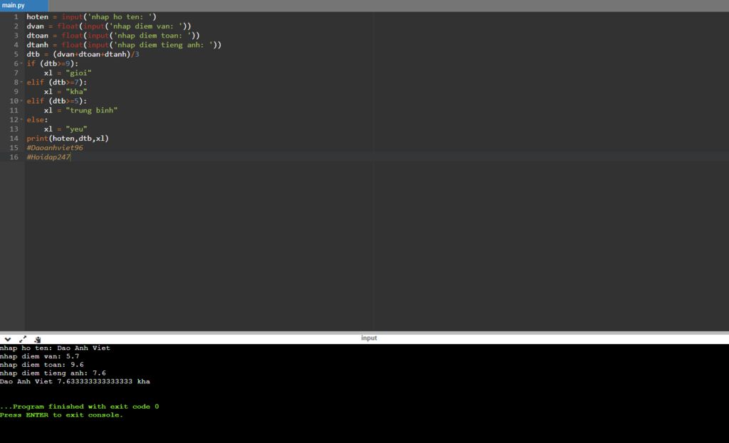 print("Hoc sinh ",ten,": Diem trung binh ",int(tb),"| Xep loai ",xep_loai)