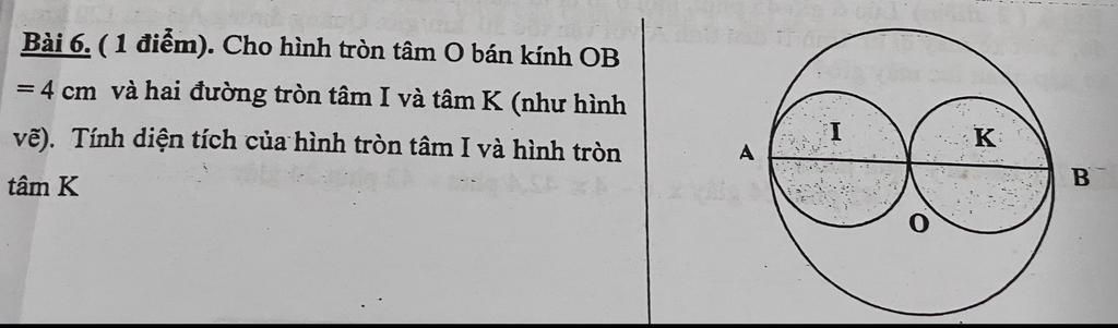 Bán kính hình tròn tâm `O` là đường kính của hình tròn tâm `I` và tâm `K` => Diện tích hình tròn tâm `I` và tâm `K` bằng nhau.