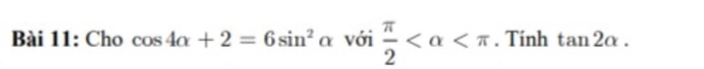 $\cos 4 \alpha+2=6\sin^2\alpha\\ \Leftrightarrow 2\cos2 \alpha-1+2=6.\dfrac{1-\cos 2\alpha}{2}\\ \Leftrightarrow 2\cos2 \alpha+1=3(1-\cos 2\alpha)\\ \Leftrightarrow 2\cos2 \alpha+1=3-3\cos 2\alpha\\ \Leftrightarrow 2\cos2 \alpha+3\cos 2\alpha-2=0\\ \Leftrightarrow \left[\begin{array}{l} \cos 2 \alpha=\dfrac{1}{2} \\ \cos2 \alpha=-2 (L) \end{array} \right.\\ \dfrac{\pi}{2} < \alpha < \pi\\ \Rightarrow \pi < 2 \alpha < 2 \pi\\ \Rightarrow \sin 2 \alpha <0\\ \sin^22 \alpha +\cos^22 \alpha=1\\ \Rightarrow \sin 2 \alpha=-\dfrac{\sqrt{3}}{2}\\ \tan 2\alpha=\dfrac{\sin 2 \alpha}{\cos 2 \alpha}=-\sqrt{3}.$