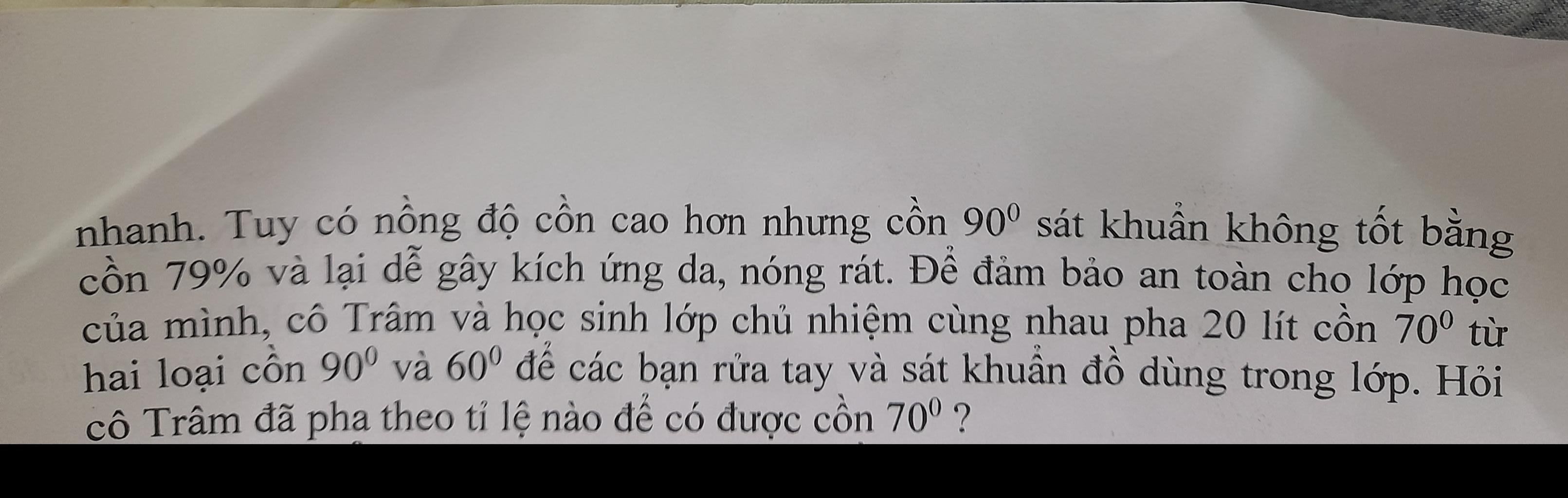 Vậy cần pha cồn $60^o$ với cồn $90^o$ theo tỉ lệ là $2:1$