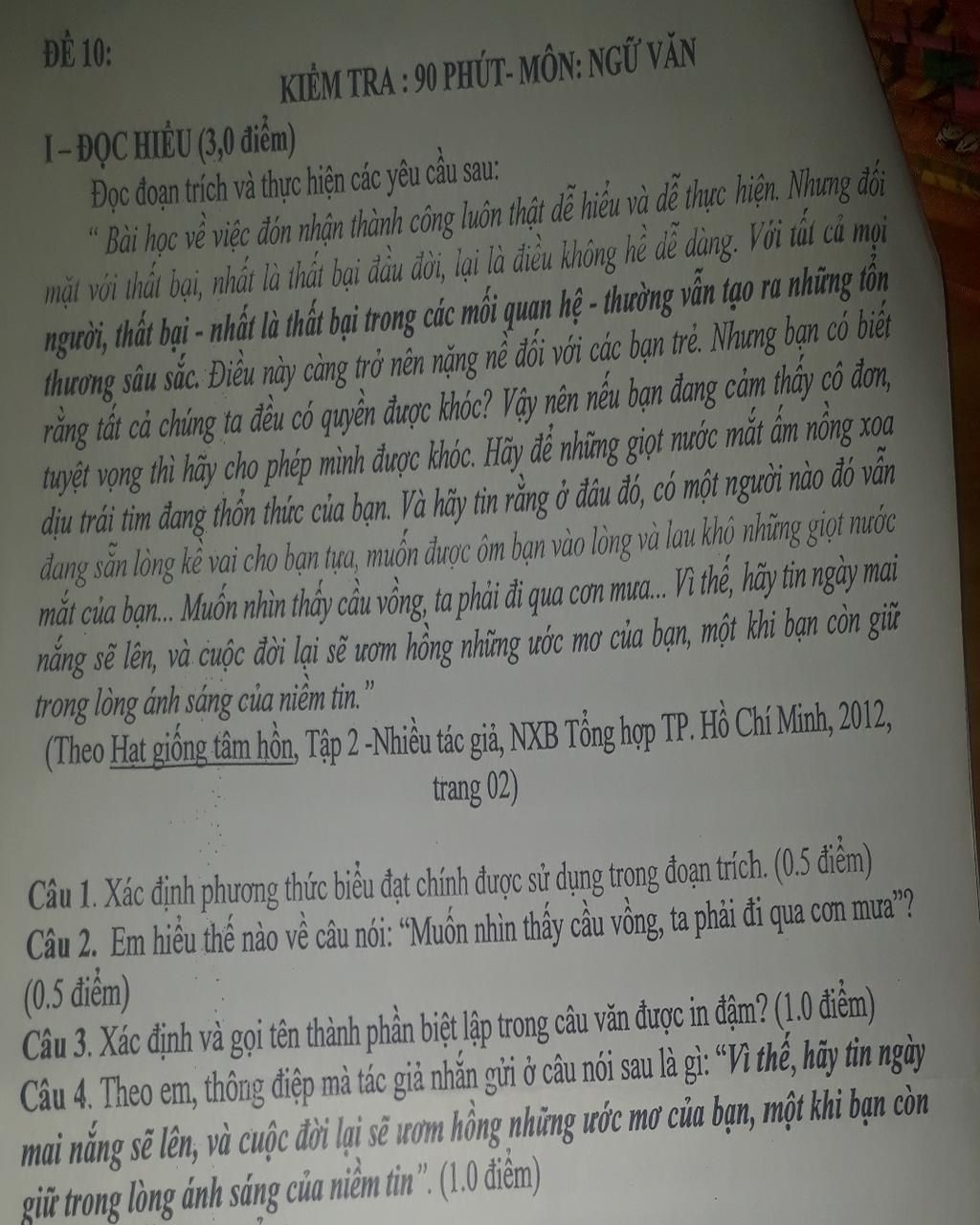Câu 2: Câu nói Muốn nhìn thấy cầu vồng ta phải đi qua cơn mưa muốn nhắn nhủ: để vươn tới thành công, những gì đẹp đẽ, tinh tuý thì phải chấp nhận trải qua những khó khăn, phong ba, bão táp.