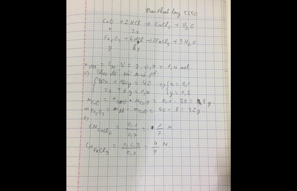 Gọi $x,y$ là số mol $CuO, Fe_2O_3$ $(x,y>0)$ thì ta có hệ sau: