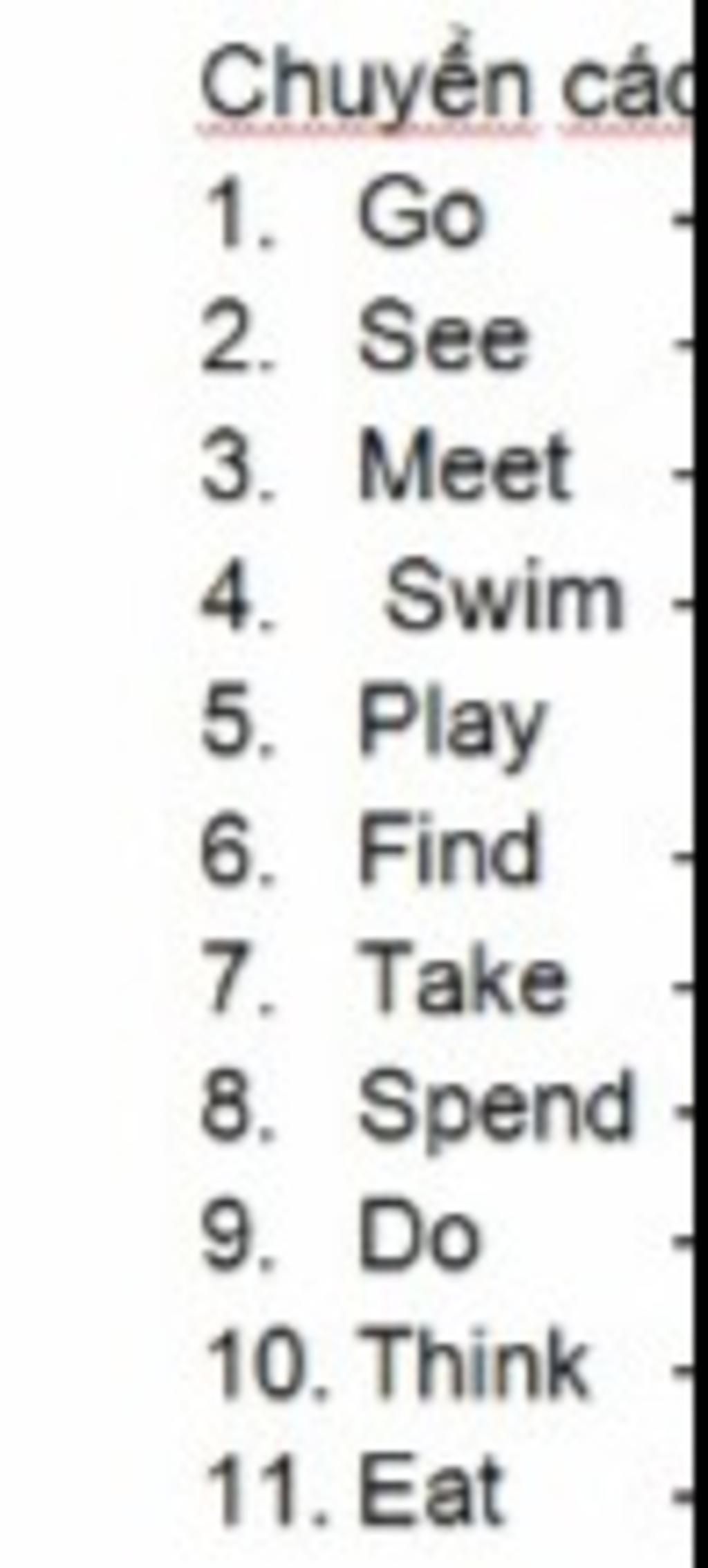 \begin{array}{|c|c|c|}\hline \text{}&\text{quá khứ}&\text{quá khứ phân từ}\\\hline \text{go}&\text{went}&\text{gone}\\\hline \text{see}&\text{saw}&\text{seen}\\\hline \text{meet}&\text{met}&\text{met}\\\hline \text{swim}&\text{swam}&\text{swum}\\\hline \text{play}&\text{played}&\text{played}\\\hline \text{find}&\text{found}&\text{found}\\\hline \text{take}&\text{took}&\text{taken}\\\hline \text{spend}&\text{spent}&\text{spent}\\\hline \text{do}&\text{did}&\text{done}\\\hline \text{think}&\text{thought}&\text{thought}\\\hline \text{eat}&\text{ate}&\text{eaten}\\\hline\end{array}