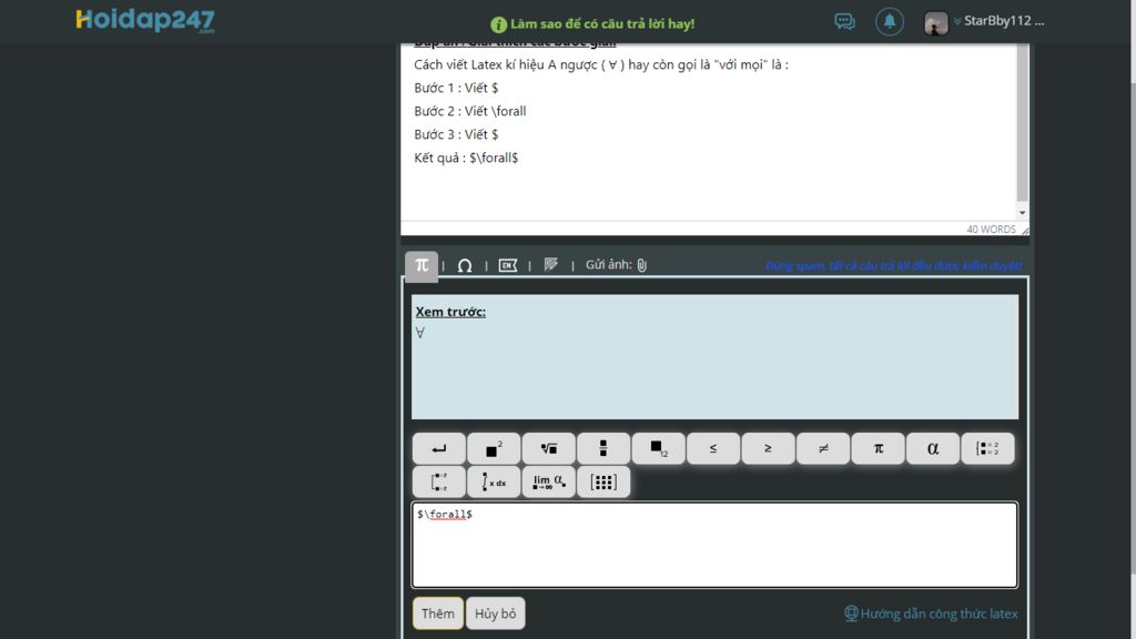 Cách viết Latex kí hiệu A ngược ( ∀ ) hay còn gọi là "với mọi" là :