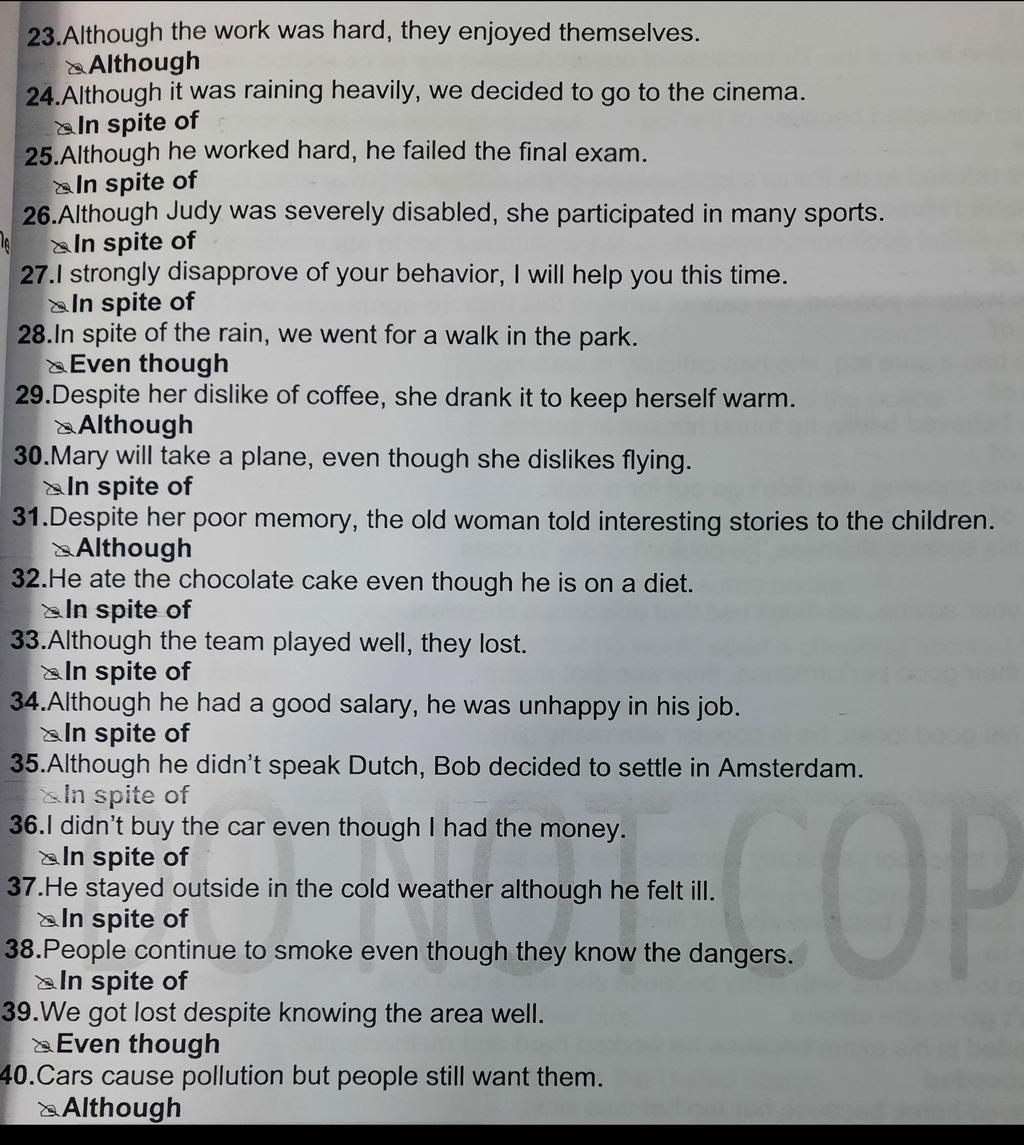 `25.` `→` In spite of working hard, he failed the final exam.