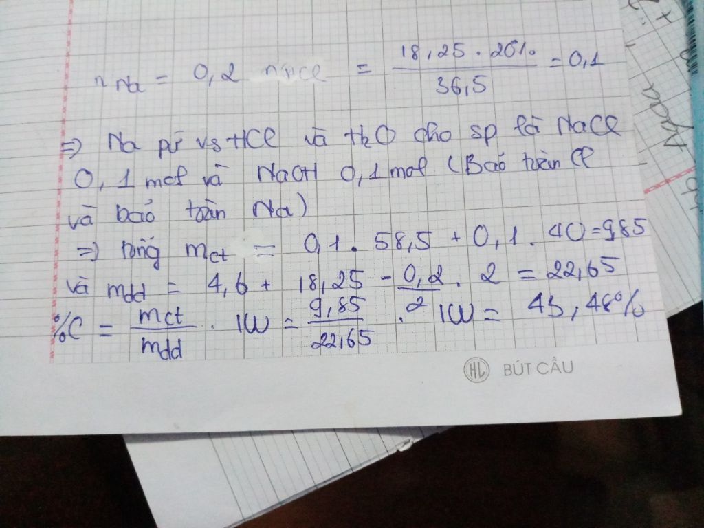 $\begin{gathered} {m_{{\text{dd}}\,\,sau}} = {m_{Na}} + {m_{{\text{dd}}\,\,HCl}} - {m_{{H_2}}} \hfill \\ \,\,\,\,\,\,\,\,\,\,\,\,\,\,\,\,\,\,\,\,\,\,\,\,\,\,\,\,\,\,\,\,\,\,\,\,\,\,\,\,\,\,\,\,\,\,\,\,\,\,\,\,\,\,\,\,\,\,\,\,\,\,\,\,\,\,\,\,\,\,\,\,\,\, = 4,6 + 18,25 - (0,05 + 0,05).2 = 22,65\,\,gam \hfill \\ \end{gathered} $