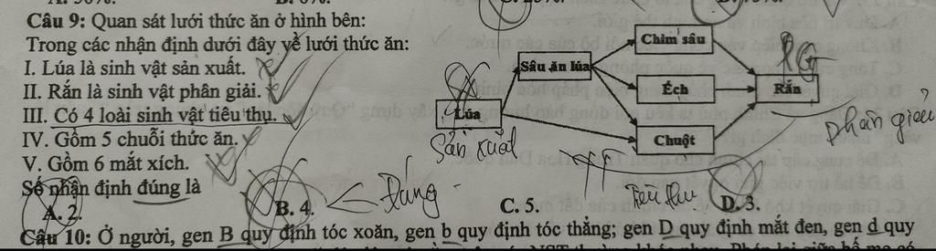 $III-sai$ .Có $5$ loài sinh vật tiêu thụ là: sâu ăn lúa, chim sâu,ếch,chuột ,rắn