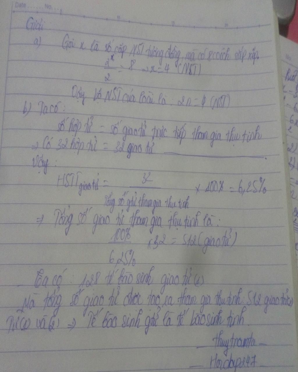 b. Một tế bào sinh dục sơ khai của loài đó nguyên phân liên tiếp nhiều lần tạo ra 128 tế bào sinh giao tử. Các tế bào được sinh ra đều giảm phân tạo giao tử. Hiệu suất thụ tinh của các giao tử là 6,25%, số hợp tử được tạo thành là 32. Tế bào sinh dục nói trên là tế bào sinh tinh hay tế bào sinh trứng? Giải thích.