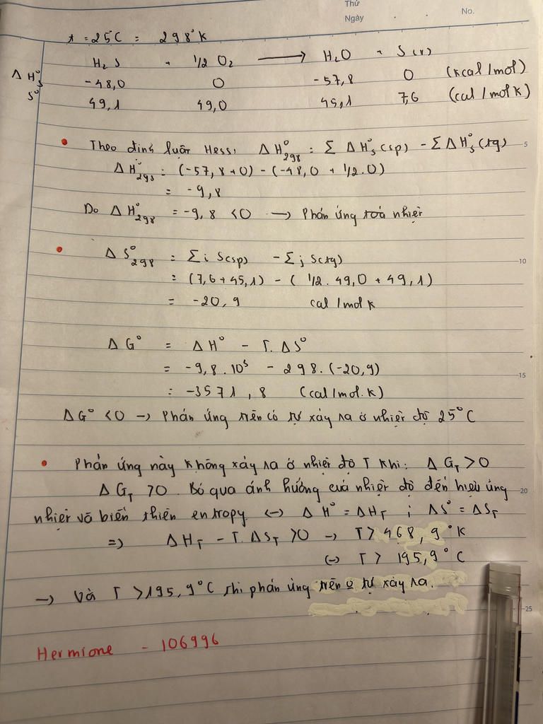 Phản ứng sau đây tỏa nhiệt hay thu nhiệt? Ở 25oC phản ứng có tự xảy ra hay không? Ở nhiệt độ nào phản ứng không tự xảy ra?