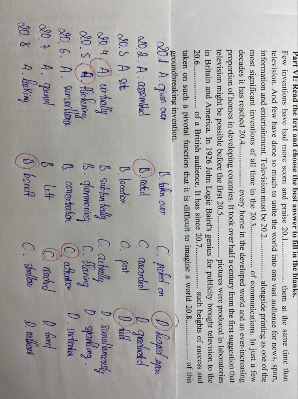 Part VI: Read the text and choose the best answer to fill in the blanks.