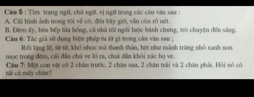 Câu `5:`(in đậm : chủ ngữ ; in nghiêng : trạng ngữ ; gạch chân : vị ngữ )