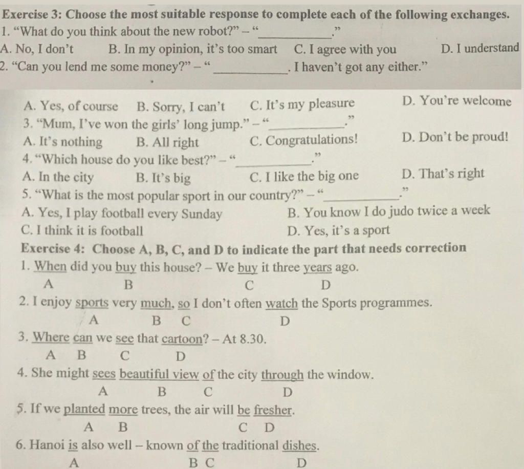 Exercise 3: Choose the most suitable response to complete each of the following exchanges.