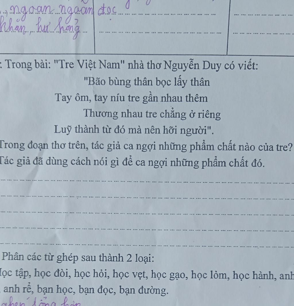 - Trong đoạn thơ trên, tác giả đã ca ngợi những phẩm chất của cây tre: Đoàn kết, đùm bọc, thương yêu, tương trợ lẫn nhau.