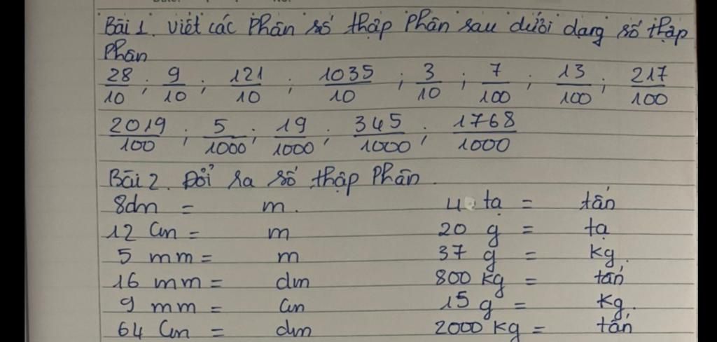 `8 dm = 8 : 10 = 0,8 m` ; $4$ tạ `= 4 : 10 = 0,4` tấn