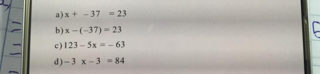 `c) 123 - 5x = -63`
