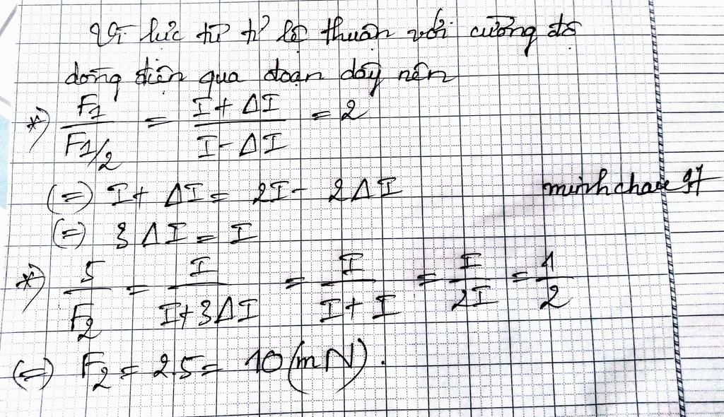 Một đoạn dây dẫn dài 1 m đặt trong từ trường đều và vuông góc với vectơ cảm ứng từ. Người ta thay đổi cường độ dòng điện qua đoạn dây. Khi cường độ dòng điện chạy trong dây là I, I + ΔI , I - ΔI , I + 3 ΔI thì lực từ tác dụng lên đoạn dây tương ứng là 5 mN, F1,F1/2, F2. Vậy F2 gần với giá trị nào nhất?