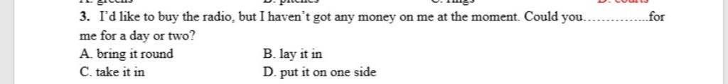 3. I'd like to buy the radio, but I haven't got any money on me at the moment. Could you.. me for a day or two?