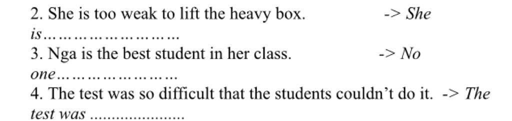 `=>` S + is / am / are / ... + too adj ( for O ) + to do sth