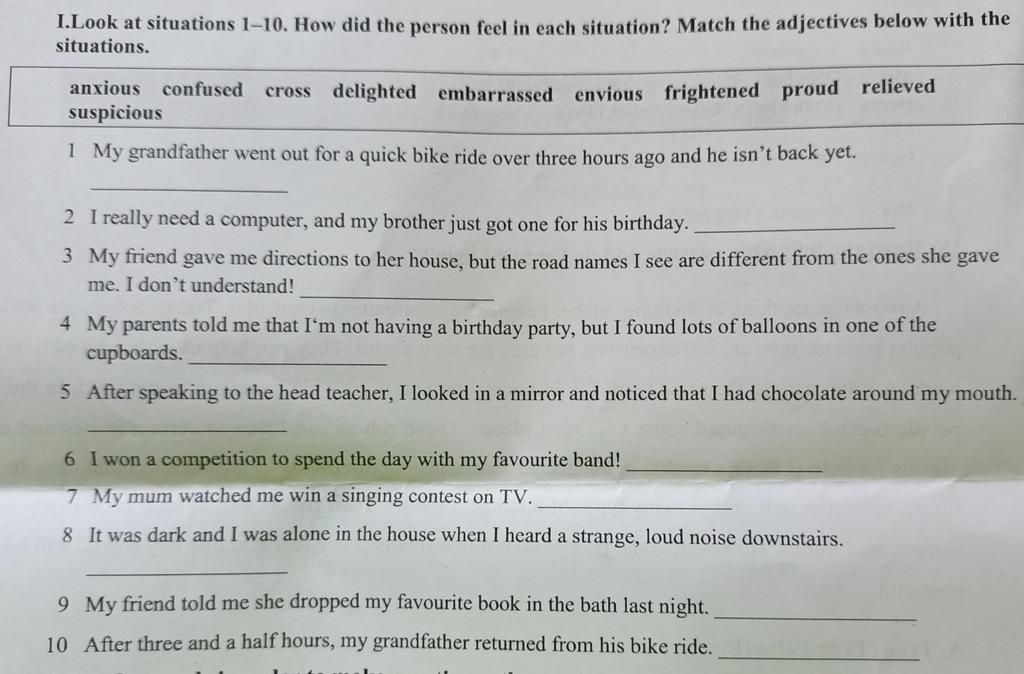 I.Look at situations 1-10. How did the person feel in each situation? Match the adjectives below with the