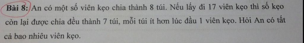 $\text{Nếu bỏ thêm 1 chiếc kẹo vào 7 cái túi thì số kẹo bị thừa ra là :}$