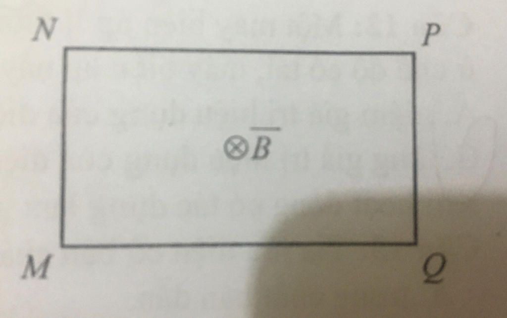 Một khung dây dẫn kín hình chữ nhật $MNPQ$ đặt cố định trong từ trường đều. Hướng của từ trường $\overrightarrow{B}$ vuông góc với mặt phẳng khung dây như hình bên. Trong khung dây có dòng điện chạy theo chiều $NMQPN$. Lực từ tác dụng lên cạnh $MN$ cùng hướng với A. Vectơ $\overrightarrow{PQ}$ B. Vectơ $\overrightarrow{NP}$ C. Vectơ $\overrightarrow{QM}$ D. Vectơ $\overrightarrow{MN}$