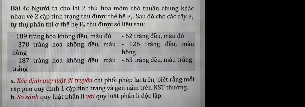 187 tràng hoa ko đều màu trắng :63 tràng đêu đỏ= 3 tràng hoa ko đều, trắng :1 tràng đều đỏ=> đây là tỉ lệ quy luật phân li của men den