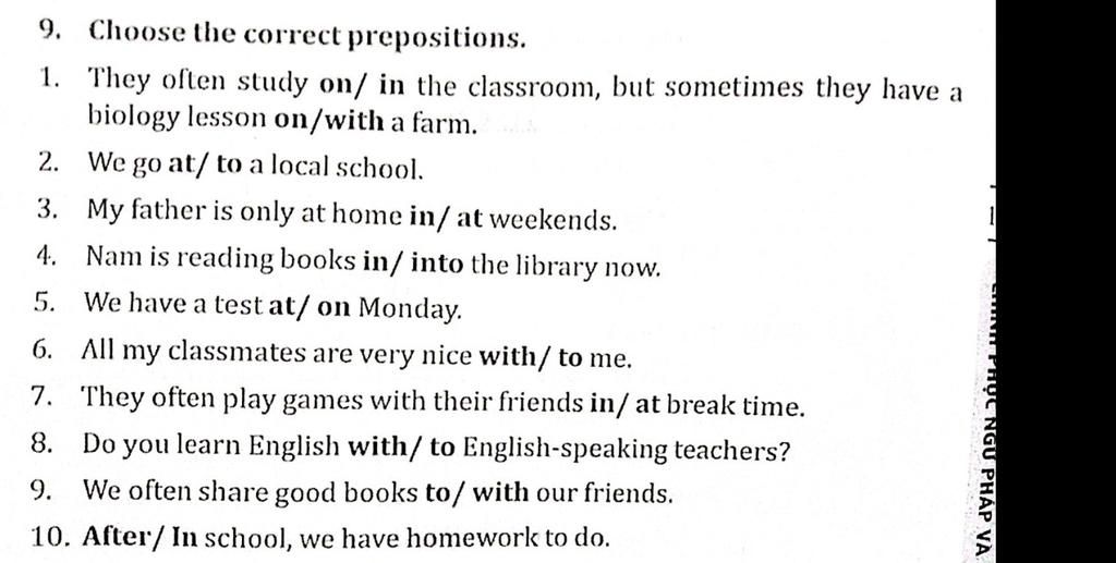 Giới từ at ở đây dùng cho weekends. at weekends: vào cuối tuần
