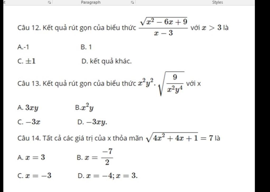 Câu 14. Tất cả các giá trị của x thỏa mãn V