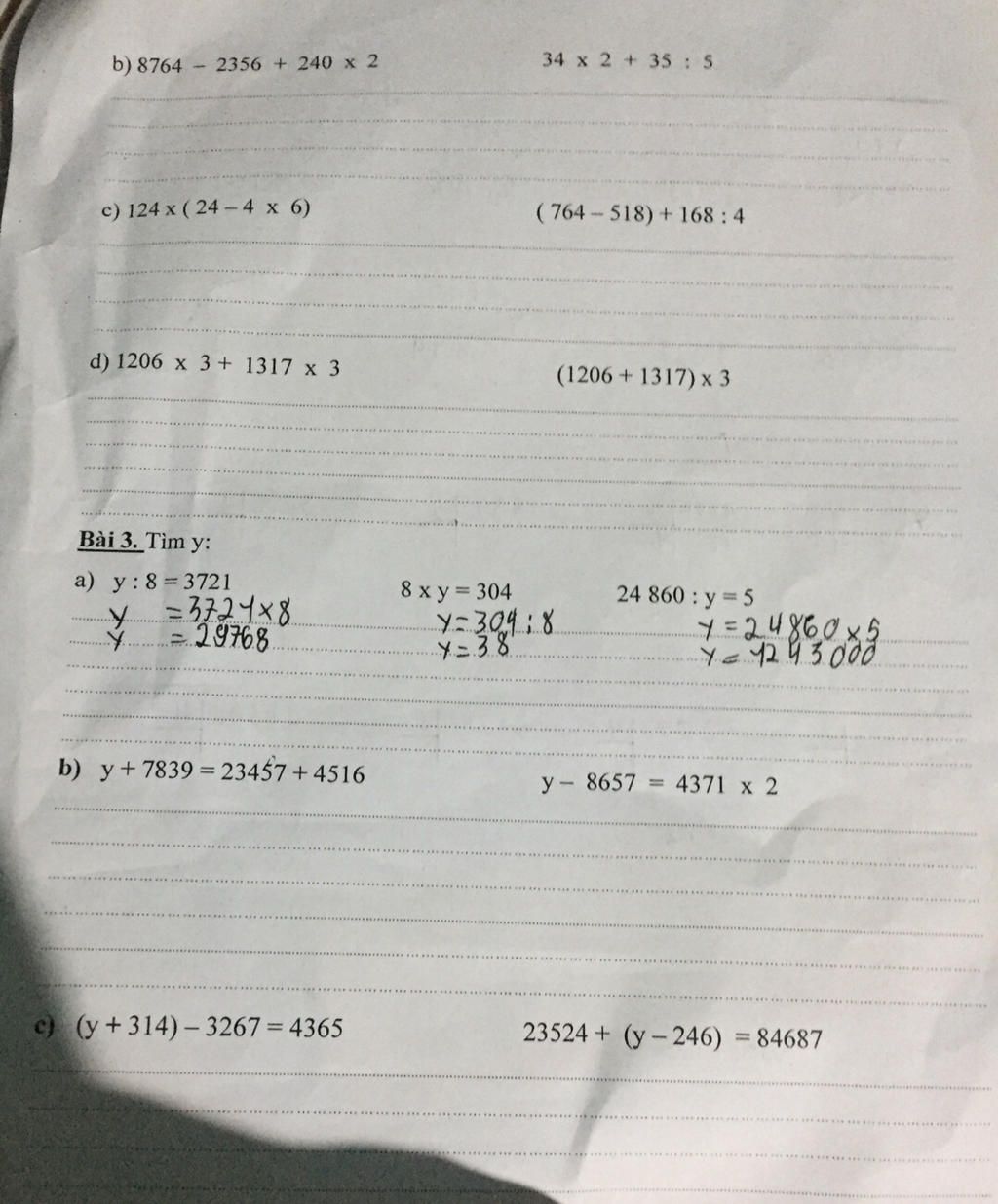 c) (y + 314) - 3267 = 4365 23254 + (y - 246) = 84687