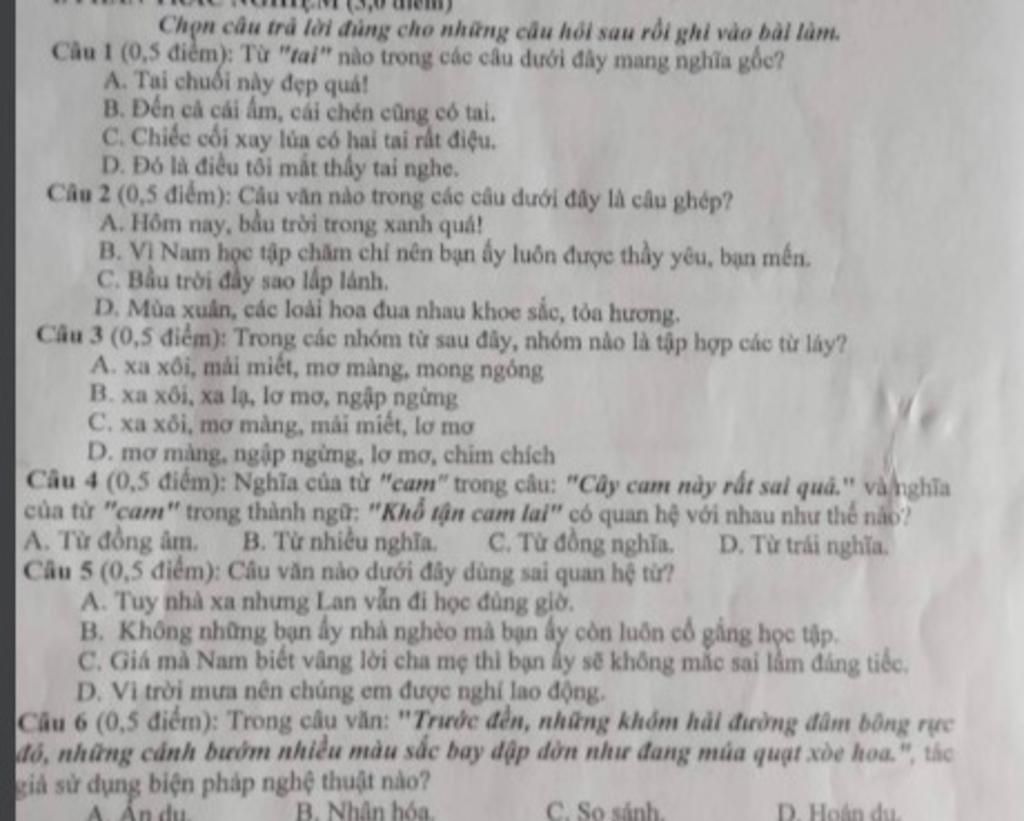 Câu 1 (0,5 điểm): Từ "tai" nào trong các cấu dưới đây mang nghĩa gốc?
