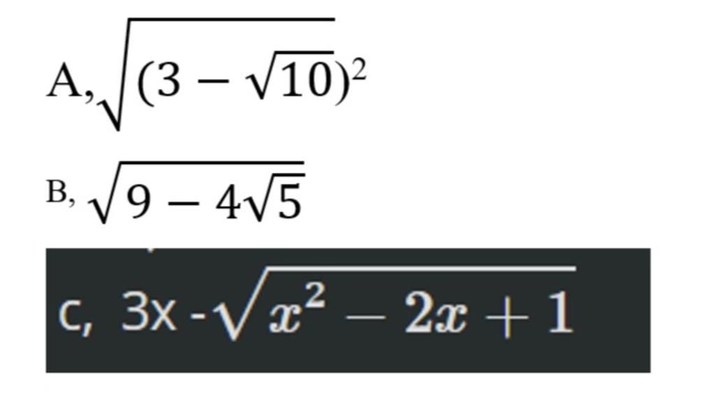 $A=\sqrt{(3-\sqrt{10})^2}=|3-\sqrt{10}|=\sqrt{10}-3$