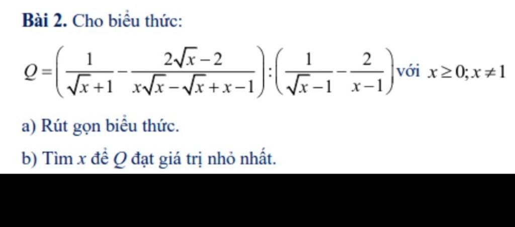 $\text{a) Q = ($\dfrac{1}{\sqrt{x} + 1}$ - $\dfrac{2\sqrt{x} - 2}{x\sqrt{x} - \sqrt{x} + x - 1}$ ) : ($\dfrac{1}{\sqrt{x} - 1}$ - $\dfrac{2}{x - 1}$) Đkxđ: x $\geq$ 0; x $\neq$ 1}$