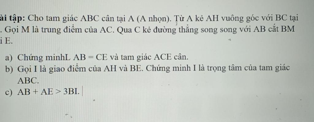c.Ta có: $AB+AE>BE=2BM=2\cdot \dfrac32BI=3BI$ vì $I$ là trọng tâm $\Delta ABC$