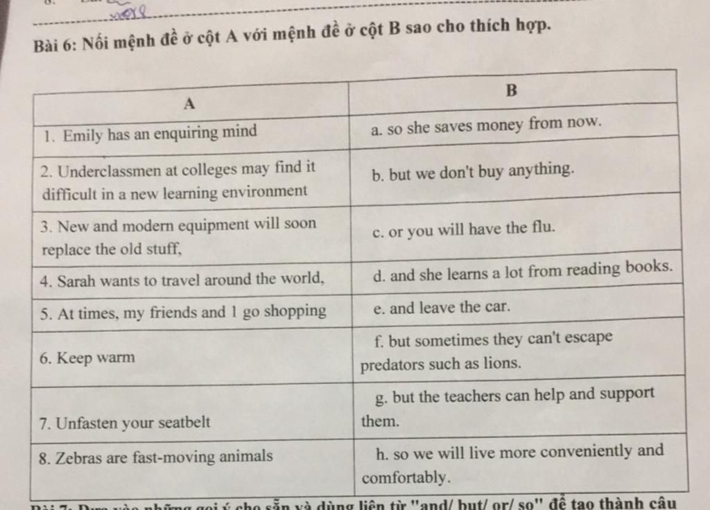 Bài 6: Nối mệnh đề ở cột A với mệnh đề ở cột B sao cho thích hợp.