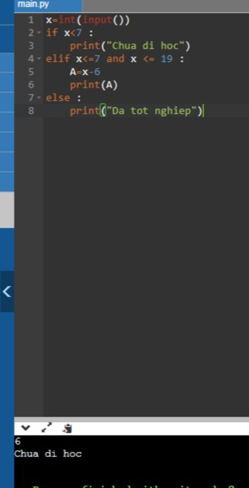 # Vậy nếu X < 7 thì in ra " Chua di hoc, o nha cham em" ( kiểu như thế )