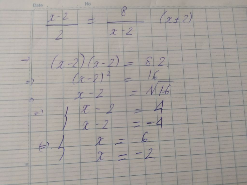 $\frac{x-2}{2}=\frac{8}{x-2}$