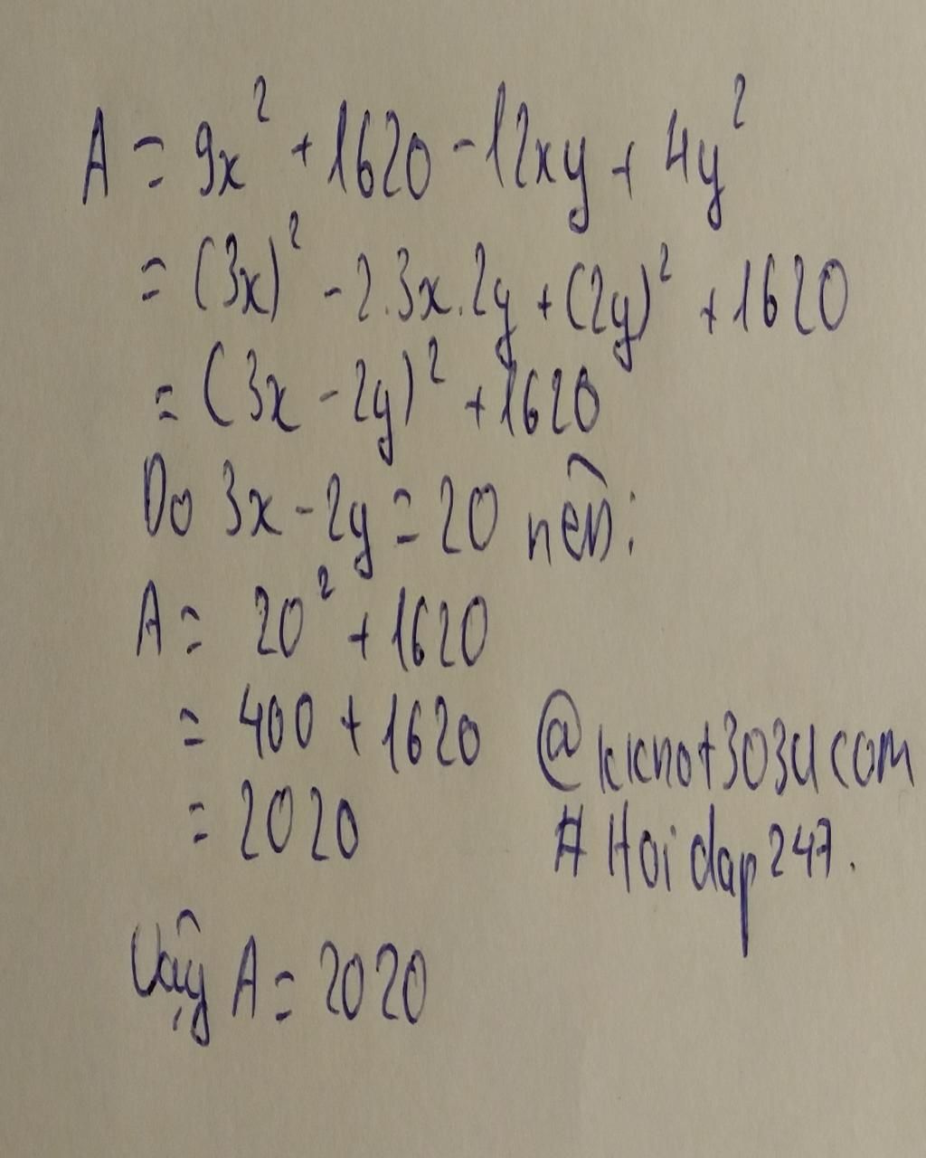 `<=> A = 9x^2 - 12xy + 4y^2 + 1620`